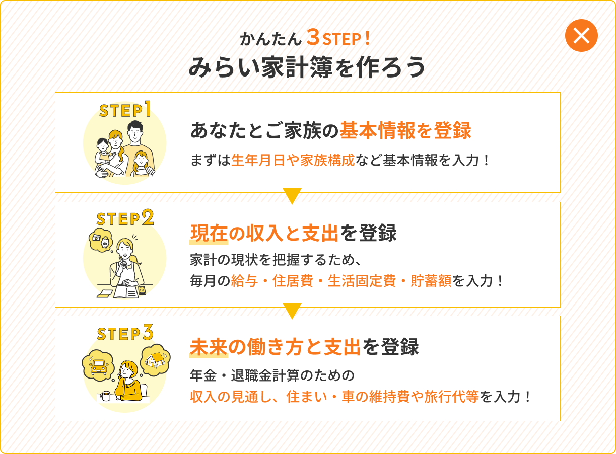 お客様の提供する個人情報を基に、将来の資産状況や家計の予測を行い、具体的な計画を提案します。