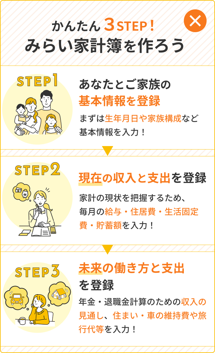 本サービスは、利用者が、自身の家族構成や現在・未来の家計情報を入力することで、みらい家計簿を作成し、将来の家計をシミュレーションすることができます。また、利用者は本サービス上で家計見直しのプロや資産運用のプロからアドバイスを受けることができます。